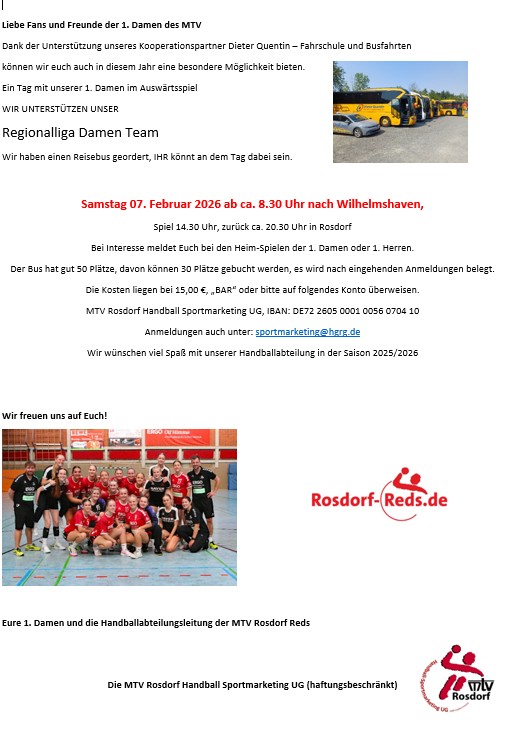 Allgemein #1. Damen – Samstag 07. Februar 2026 ab ca. 8.30 Uhr mit dem Bus nach Wilhelmshaven 13. Januar 2026 Administrator Wir wünschen viel Spaß mit unserer Handballabteilung in der Saison 2025/2026 Wir freuen uns auf Euch!Eure 1. Damen und die Handballabteilungsleitung der MTV Rosdorf RedsDie MTV Rosdorf Handball Sportmarketing UG (haftungsbeschränkt)